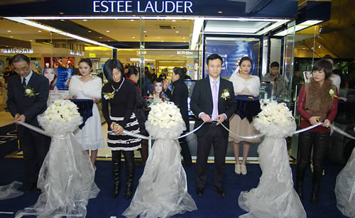 剪彩現(xiàn)場(chǎng),禮儀小姐為顧客展示雅詩(shī)蘭黛明星產(chǎn)品