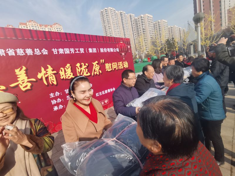 2020年1月14日,甘肅省慈善總會(huì)、蘭州市慈善會(huì)以及紅古區(qū)民政局?jǐn)y甘肅國(guó)芳工貿(mào)(集團(tuán))股份有限公司在蘭州市紅古區(qū)海石廣場(chǎng)共同舉行“慈善情暖隴原”暨物資捐贈(zèng)活動(dòng),將2000件棉衣,1200余件秋褲,2000余件保溫杯以及1000余件棉拖合計(jì)價(jià)值73.6萬元的過冬物資帶給蘭州市紅古區(qū)的困難群眾。